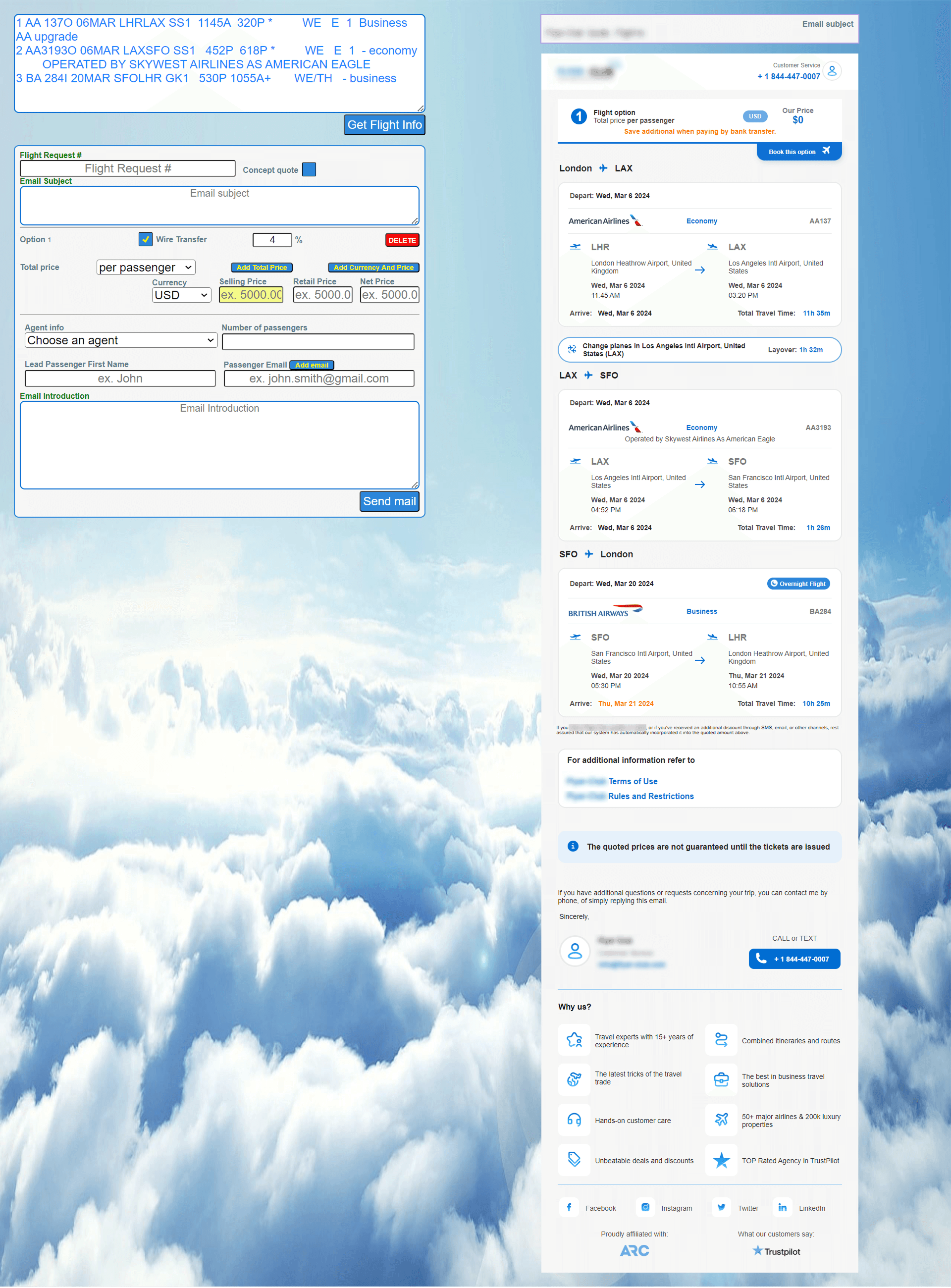 The service helped flight agents convert raw GDS data into commercial offers for clients booking business-class tickets. Customers might get 2-3 offers per week, so the process should be really fast.