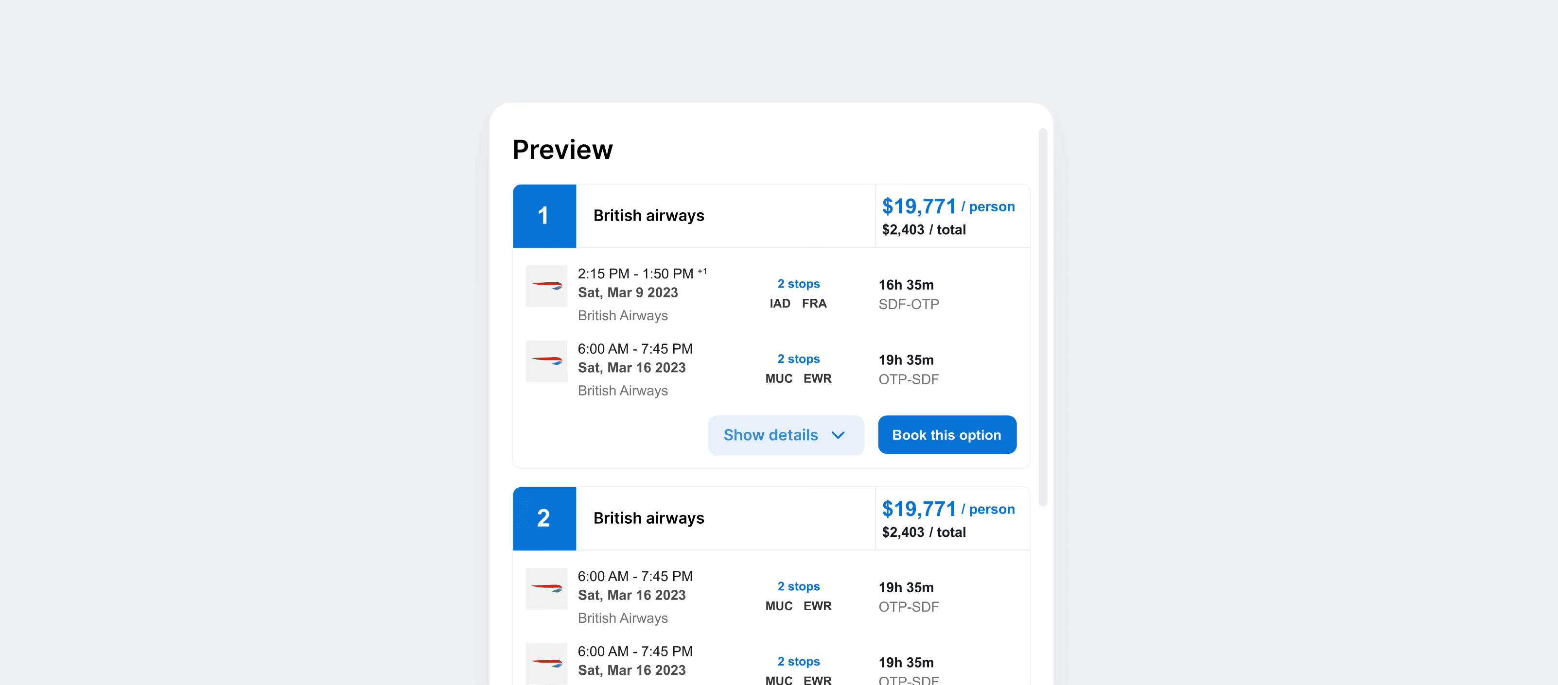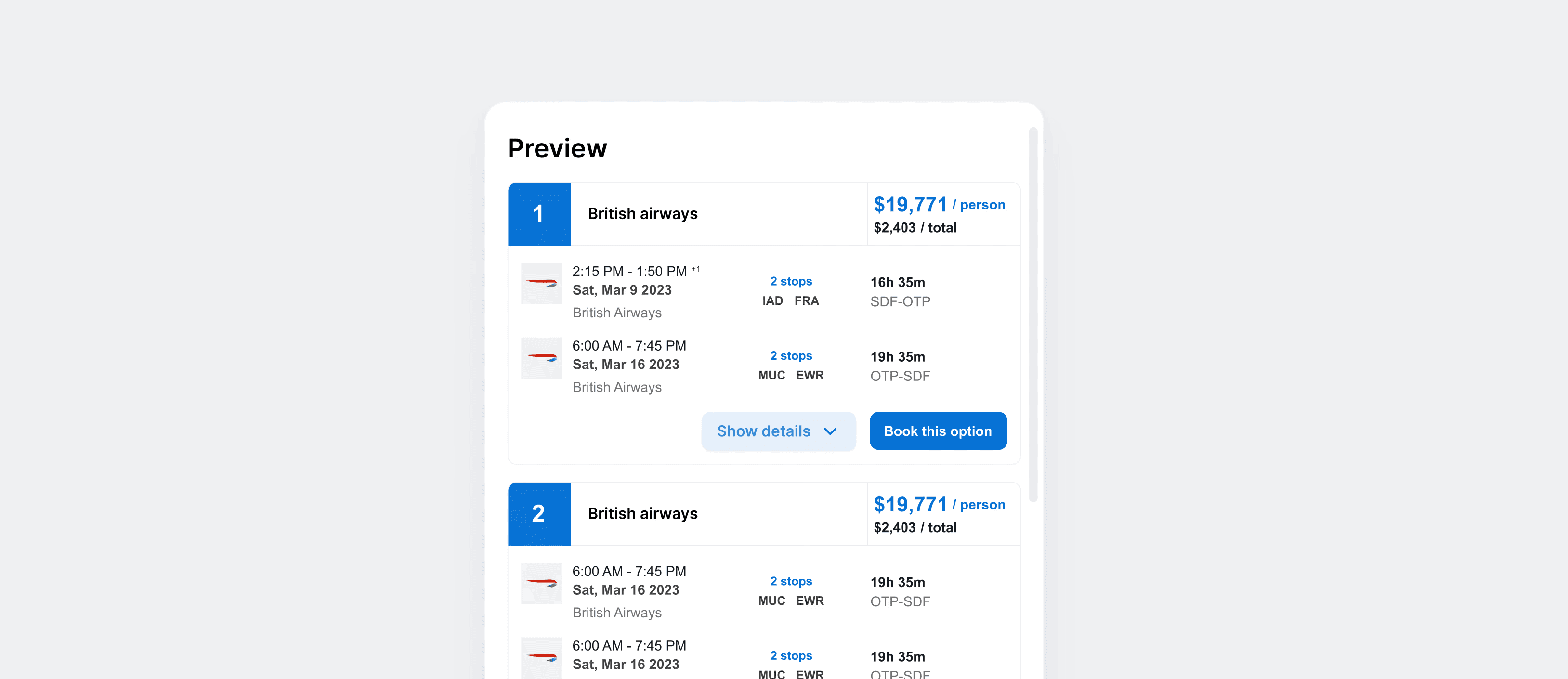 The focus was an interface in a clean style to reduce noise and keep agent’s attention on the flight options.